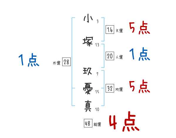 天運![]() | 小塚玖憂真さんの天運は16画の5つ星!人望が厚く大きく発展する。逆転成功が見える。 家系が持つ宿命的な運勢を表します。祖先から受け継いだ苗字ですので自分の力が及びません。家柄を象徴します。 |