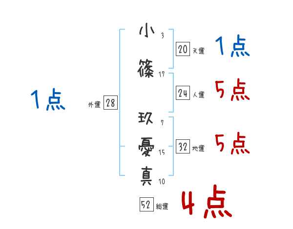 地運![]() | 小篠玖憂真さんの地運は32画の5つ星!柔軟性があり成功する。チャンスが多く金運が良い。 個性を表す基礎的な運勢です。性格形成や対人関係、行動力など家庭環境に影響されます。主に誕生してから20歳くらいまでの若年期の運勢を表します。 |
