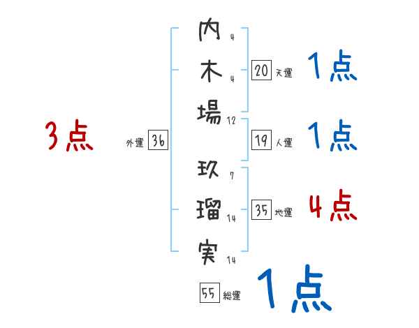 外運![]() | 内木場玖瑠実さんの外運は36画の3つ星!先見性が豊かです。多少神経質で苦労することも。 生活面を象徴する運勢です。外部から受ける影響力を表し、結婚運、家庭運や職場、環境への順応性を表します。 |