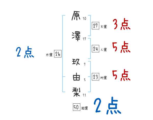 外運![]() | 原澤玖由梨さんの外運は26画の2つ星!波瀾万丈かも。信頼できる人を大事にしましょう。 生活面を象徴する運勢です。外部から受ける影響力を表し、結婚運、家庭運や職場、環境への順応性を表します。 |