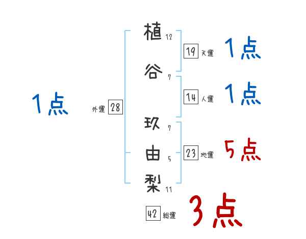 外運![]() | 植谷玖由梨さんの外運は28画の1つ星!家庭環境に注意。スポーツで活躍できる能力があるかも。 生活面を象徴する運勢です。外部から受ける影響力を表し、結婚運、家庭運や職場、環境への順応性を表します。 |