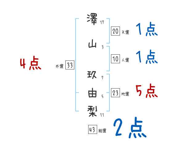 | 天運  | 澤山玖由梨さんの天運は20画の1つ星!社交が苦手。人とは違った才能があり波乱万丈な人生かも。家系が持つ宿命的な運勢を表します。祖先から受け継いだ苗字ですので自分の力が及びません。家柄を象徴します。 |