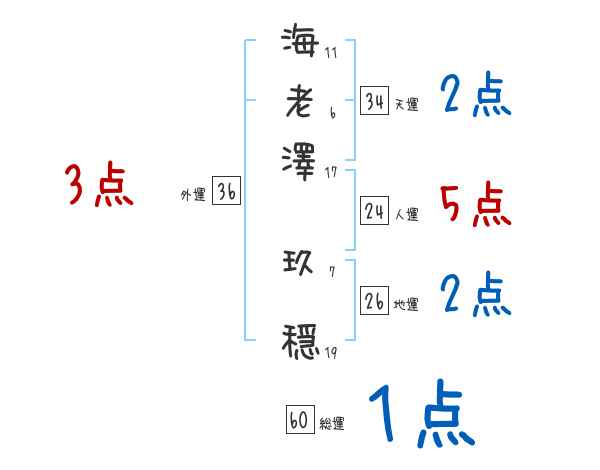 外運![]() | 海老澤玖穏さんの外運は36画の3つ星!先見性が豊かです。多少神経質で苦労することも。 生活面を象徴する運勢です。外部から受ける影響力を表し、結婚運、家庭運や職場、環境への順応性を表します。 |