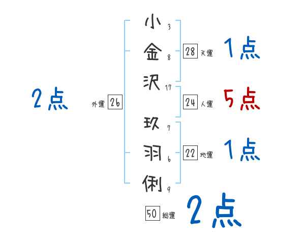 外運![]() | 小金沢玖羽俐さんの外運は26画の2つ星!波瀾万丈かも。信頼できる人を大事にしましょう。 生活面を象徴する運勢です。外部から受ける影響力を表し、結婚運、家庭運や職場、環境への順応性を表します。 |