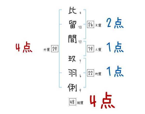 天運![]() | 比留間玖羽俐さんの天運は26画の2つ星!波瀾万丈かも。信頼できる人を大事にしましょう。 家系が持つ宿命的な運勢を表します。祖先から受け継いだ苗字ですので自分の力が及びません。家柄を象徴します。 |