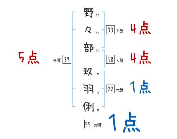 天運![]() | 野々部玖羽俐さんの天運は33画の4つ星!権力志向でプライドが高い。勇気があり運を切り開き成功する。 家系が持つ宿命的な運勢を表します。祖先から受け継いだ苗字ですので自分の力が及びません。家柄を象徴します。 |