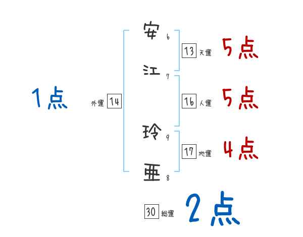 外運![]() | 安江玲亜さんの外運は14画の1つ星!人に対して優しいがストレスを溜め込みがち。人間関係のトラブルを避けるよう気をつけましょう。 生活面を象徴する運勢です。外部から受ける影響力を表し、結婚運、家庭運や職場、環境への順応性を表します。 |