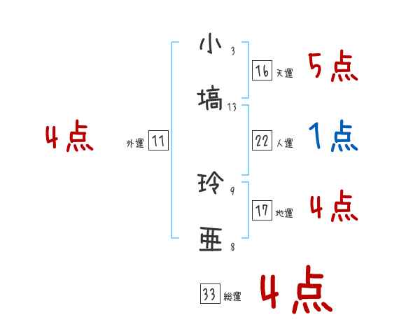 総運![]() | 小塙玲亜さんの総運は33画の4つ星!権力志向でプライドが高い。勇気があり運を切り開き成功する。 あなたの人生を表す1番重要な運勢です。生涯を通じて影響する総合運となり、主に50歳以降の晩年期に影響を及ぼします。 |