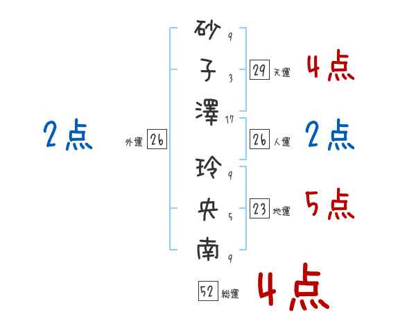 外運![]() | 砂子澤玲央南さんの外運は26画の2つ星!波瀾万丈かも。信頼できる人を大事にしましょう。 生活面を象徴する運勢です。外部から受ける影響力を表し、結婚運、家庭運や職場、環境への順応性を表します。 |