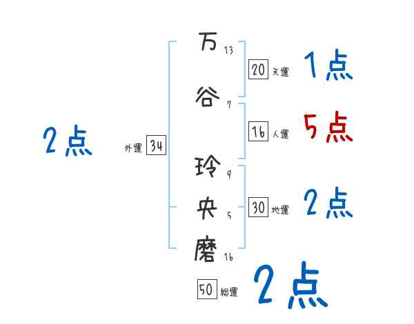 人運![]() | 万谷玲央磨さんの人運は16画の5つ星!人望が厚く大きく発展する。逆転成功が見える。 性格や才能などを表す2番目に重要な運勢です。人間関係や協調性、社会的な成功に影響します。主に20歳から50歳ぐらいまでの中年期の運勢を表します。 |