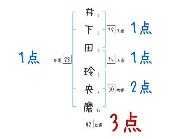天運![]() | 井下田玲央磨さんの天運は12画の1つ星!簡単な失敗で諦めてしまいやすいかも。着実に行動すると良いでしょう。 家系が持つ宿命的な運勢を表します。祖先から受け継いだ苗字ですので自分の力が及びません。家柄を象徴します。 |
