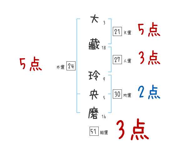 外運![]() | 大藏玲央磨さんの外運は24画の5つ星!家庭運が良く順調な人生。金運にも恵まれる。 生活面を象徴する運勢です。外部から受ける影響力を表し、結婚運、家庭運や職場、環境への順応性を表します。 |