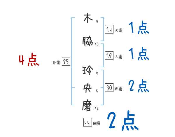 総運![]() | 木脇玲央磨さんの総運は44画の2つ星!誠実で慎重な性格。物事を考えすぎないように注意しましょう。 あなたの人生を表す1番重要な運勢です。生涯を通じて影響する総合運となり、主に50歳以降の晩年期に影響を及ぼします。 |