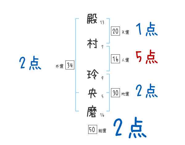 人運![]() | 殿村玲央磨さんの人運は16画の5つ星!人望が厚く大きく発展する。逆転成功が見える。 性格や才能などを表す2番目に重要な運勢です。人間関係や協調性、社会的な成功に影響します。主に20歳から50歳ぐらいまでの中年期の運勢を表します。 |