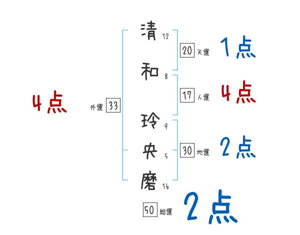 外運![]() | 清和玲央磨さんの外運は33画の4つ星!権力志向でプライドが高い。勇気があり運を切り開き成功する。 生活面を象徴する運勢です。外部から受ける影響力を表し、結婚運、家庭運や職場、環境への順応性を表します。 |
