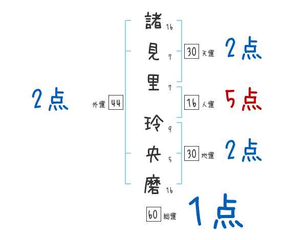 天運![]() | 諸見里玲央磨さんの天運は30画の2つ星!浮き沈みの激しさに注意しましょう。 家系が持つ宿命的な運勢を表します。祖先から受け継いだ苗字ですので自分の力が及びません。家柄を象徴します。 |