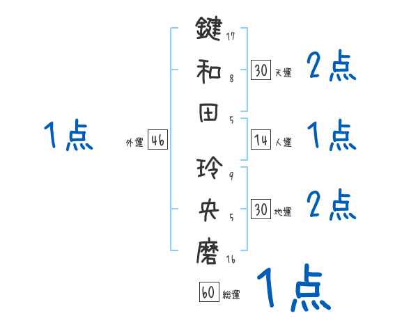総運![]() | 鍵和田玲央磨さんの総運は60画の1つ星!悲観的で迷いやすい。波乱が多く損をしないように。 あなたの人生を表す1番重要な運勢です。生涯を通じて影響する総合運となり、主に50歳以降の晩年期に影響を及ぼします。 |