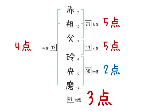天運![]() | 赤祖父玲央磨さんの天運は21画の5つ星!統率力がある。独立し成功する。名誉を手に入れる。 家系が持つ宿命的な運勢を表します。祖先から受け継いだ苗字ですので自分の力が及びません。家柄を象徴します。 |