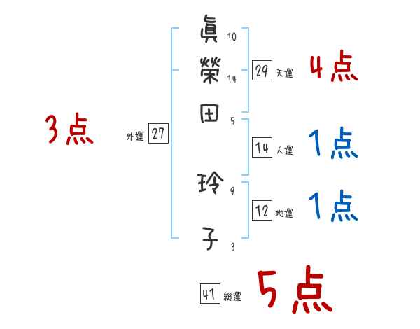 天運![]() | 眞榮田玲子さんの天運は29画の4つ星!完全主義で才能がある。厳格な心の持ち主。 家系が持つ宿命的な運勢を表します。祖先から受け継いだ苗字ですので自分の力が及びません。家柄を象徴します。 |