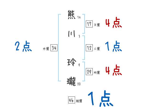 総運![]() | 熊川玲瓏さんの総運は46画の1つ星!迷走することが多く苦労するかも。目先のことにとらわれないように。 あなたの人生を表す1番重要な運勢です。生涯を通じて影響する総合運となり、主に50歳以降の晩年期に影響を及ぼします。 |