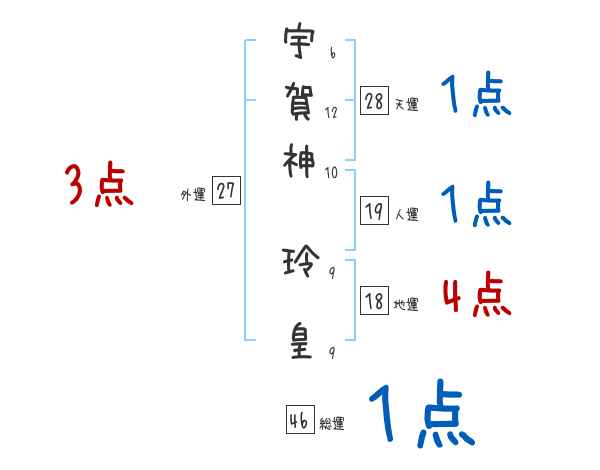 天運![]() | 宇賀神玲皇さんの天運は28画の1つ星!家庭環境に注意。スポーツで活躍できる能力があるかも。 家系が持つ宿命的な運勢を表します。祖先から受け継いだ苗字ですので自分の力が及びません。家柄を象徴します。 |