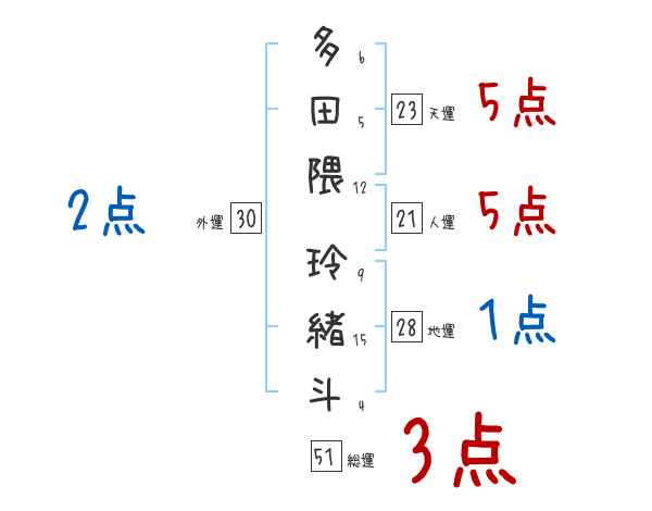 総運![]() | 多田隈玲緒斗さんの総運は51画の3つ星!変化が激しく、危険に注意。堅実な性格。 あなたの人生を表す1番重要な運勢です。生涯を通じて影響する総合運となり、主に50歳以降の晩年期に影響を及ぼします。 |