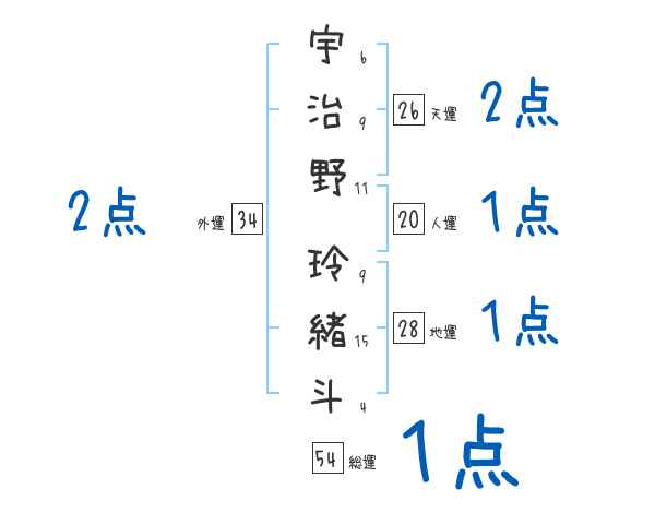 天運![]() | 宇治野玲緒斗さんの天運は26画の2つ星!波瀾万丈かも。信頼できる人を大事にしましょう。 家系が持つ宿命的な運勢を表します。祖先から受け継いだ苗字ですので自分の力が及びません。家柄を象徴します。 |