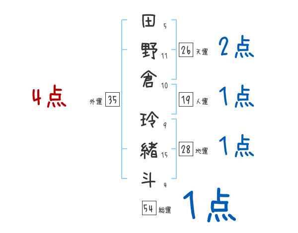 天運![]() | 田野倉玲緒斗さんの天運は26画の2つ星!波瀾万丈かも。信頼できる人を大事にしましょう。 家系が持つ宿命的な運勢を表します。祖先から受け継いだ苗字ですので自分の力が及びません。家柄を象徴します。 |
