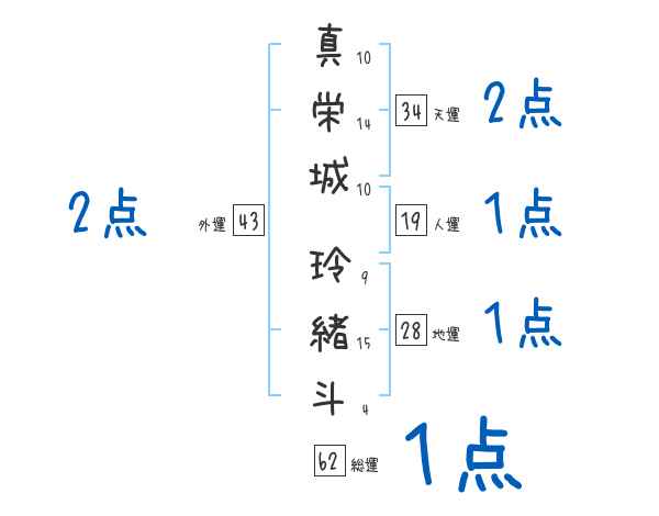 天運![]() | 真栄城玲緒斗さんの天運は34画の2つ星!独創性に優れるが、自尊心が強く災難に注意しましょう。 家系が持つ宿命的な運勢を表します。祖先から受け継いだ苗字ですので自分の力が及びません。家柄を象徴します。 |
