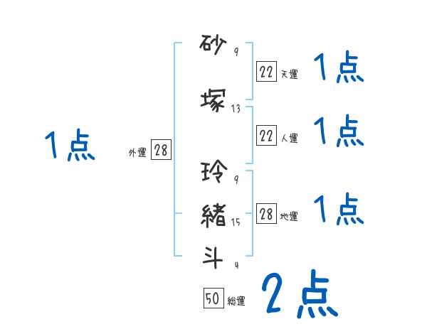 外運![]() | 砂塚玲緒斗さんの外運は28画の1つ星!家庭環境に注意。スポーツで活躍できる能力があるかも。 生活面を象徴する運勢です。外部から受ける影響力を表し、結婚運、家庭運や職場、環境への順応性を表します。 |