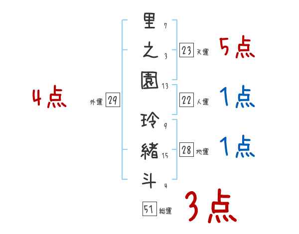 天運![]() | 里之園玲緒斗さんの天運は23画の5つ星!想像力に優れ活力がある。一代で成功し名誉を手に入れる。 家系が持つ宿命的な運勢を表します。祖先から受け継いだ苗字ですので自分の力が及びません。家柄を象徴します。 |