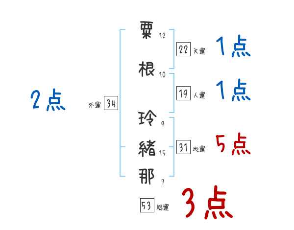 総運![]() | 粟根玲緒那さんの総運は53画の3つ星!やや見栄っ張りで虚栄心がある。散財に注意。 あなたの人生を表す1番重要な運勢です。生涯を通じて影響する総合運となり、主に50歳以降の晩年期に影響を及ぼします。 |