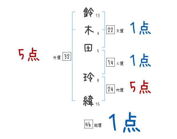 外運![]() | 鈴木田玲緯さんの外運は32画の5つ星!柔軟性があり成功する。チャンスが多く金運が良い。 生活面を象徴する運勢です。外部から受ける影響力を表し、結婚運、家庭運や職場、環境への順応性を表します。 |