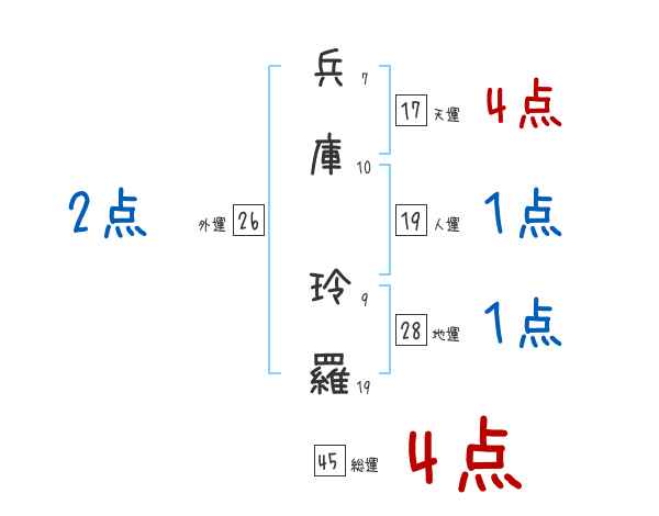 外運![]() | 兵庫玲羅さんの外運は26画の2つ星!波瀾万丈かも。信頼できる人を大事にしましょう。 生活面を象徴する運勢です。外部から受ける影響力を表し、結婚運、家庭運や職場、環境への順応性を表します。 |