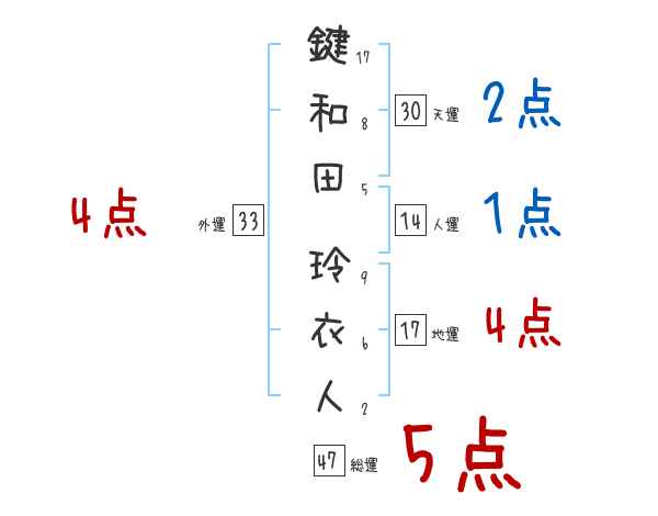 総運![]() | 鍵和田玲衣人さんの総運は47画の5つ星!実力が開花し発展する円満な人生。財に恵まれる。 あなたの人生を表す1番重要な運勢です。生涯を通じて影響する総合運となり、主に50歳以降の晩年期に影響を及ぼします。 |