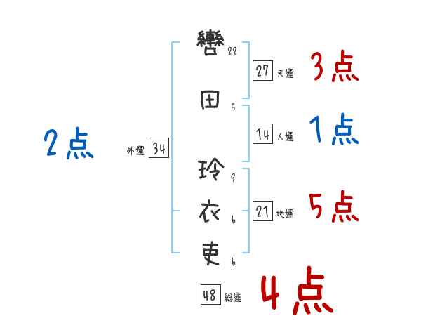 外運![]() | 轡田玲衣吏さんの外運は34画の2つ星!独創性に優れるが、自尊心が強く災難に注意しましょう。 生活面を象徴する運勢です。外部から受ける影響力を表し、結婚運、家庭運や職場、環境への順応性を表します。 |