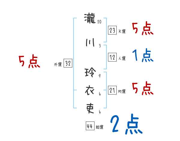 天運![]() | 瀧川玲衣吏さんの天運は23画の5つ星!想像力に優れ活力がある。一代で成功し名誉を手に入れる。 家系が持つ宿命的な運勢を表します。祖先から受け継いだ苗字ですので自分の力が及びません。家柄を象徴します。 |