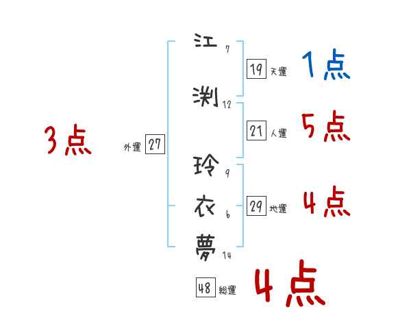 外運![]() | 江渕玲衣夢さんの外運は27画の3つ星!頭脳明晰だが強情で摩擦が多い傾向。孤立に注意。 生活面を象徴する運勢です。外部から受ける影響力を表し、結婚運、家庭運や職場、環境への順応性を表します。 |