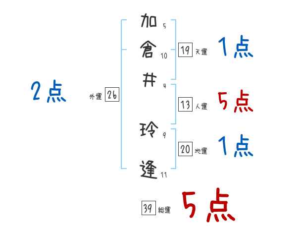 総運![]() | 加倉井玲逢さんの総運は39画の5つ星!社交性に優れ人望が厚い。人の上に立ち成功する。 あなたの人生を表す1番重要な運勢です。生涯を通じて影響する総合運となり、主に50歳以降の晩年期に影響を及ぼします。 |