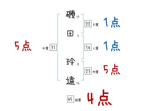 天運![]() | 磯田玲遠さんの天運は22画の1つ星!努力することが苦手ないっぽう手先が器用。芸術性にも優れる。 家系が持つ宿命的な運勢を表します。祖先から受け継いだ苗字ですので自分の力が及びません。家柄を象徴します。 |
