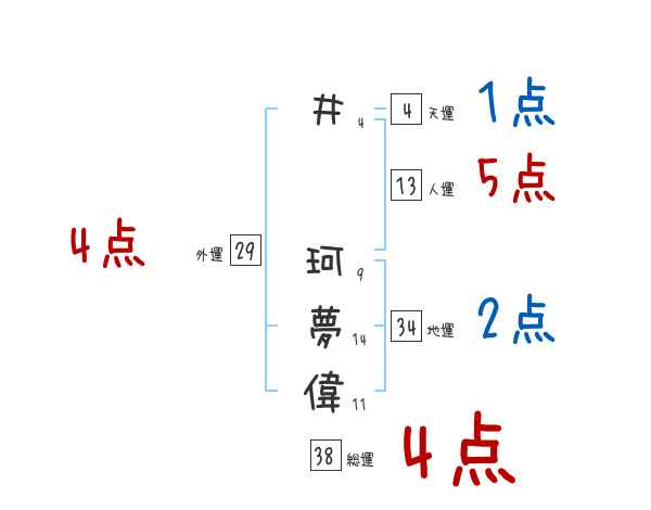 天運![]() | 井珂夢偉さんの天運は4画の1つ星!感情が不安定で苦労するかも。周囲との協調を心掛けましょう。 家系が持つ宿命的な運勢を表します。祖先から受け継いだ苗字ですので自分の力が及びません。家柄を象徴します。 |