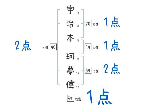 総運![]() | 宇治本珂夢偉さんの総運は54画の1つ星!トラブルが多いかも。周りをよく見て協調して過ごしましょう。 あなたの人生を表す1番重要な運勢です。生涯を通じて影響する総合運となり、主に50歳以降の晩年期に影響を及ぼします。 |