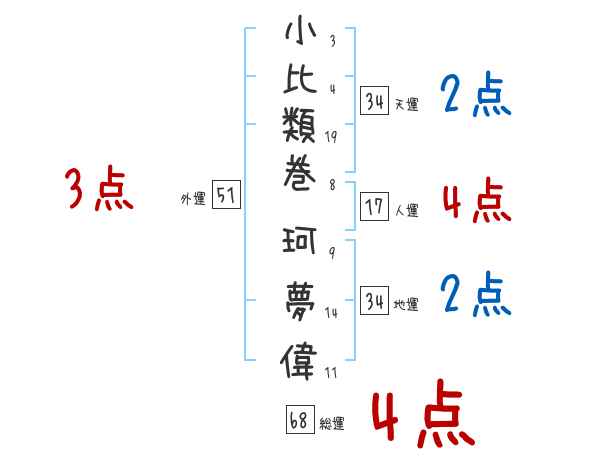 外運![]() | 小比類巻珂夢偉さんの外運は51画の3つ星!変化が激しく、危険に注意。堅実な性格。 生活面を象徴する運勢です。外部から受ける影響力を表し、結婚運、家庭運や職場、環境への順応性を表します。 |