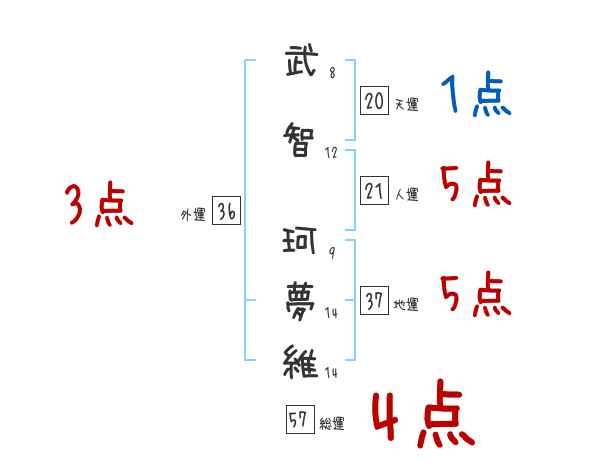 外運![]() | 武智珂夢維さんの外運は36画の3つ星!先見性が豊かです。多少神経質で苦労することも。 生活面を象徴する運勢です。外部から受ける影響力を表し、結婚運、家庭運や職場、環境への順応性を表します。 |