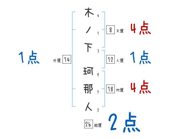 総運![]() | 木ノ下珂那人さんの総運は26画の2つ星!波瀾万丈かも。信頼できる人を大事にしましょう。 あなたの人生を表す1番重要な運勢です。生涯を通じて影響する総合運となり、主に50歳以降の晩年期に影響を及ぼします。 |