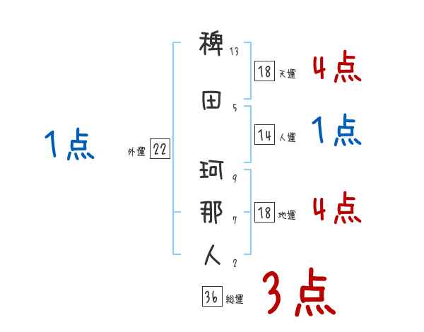 総運![]() | 稗田珂那人さんの総運は36画の3つ星!先見性が豊かです。多少神経質で苦労することも。 あなたの人生を表す1番重要な運勢です。生涯を通じて影響する総合運となり、主に50歳以降の晩年期に影響を及ぼします。 |