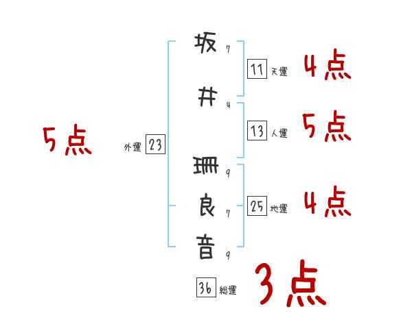 総運![]() | 坂井珊良音さんの総運は36画の3つ星!先見性が豊かです。多少神経質で苦労することも。 あなたの人生を表す1番重要な運勢です。生涯を通じて影響する総合運となり、主に50歳以降の晩年期に影響を及ぼします。 |