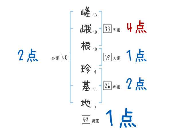 天運![]() | 嵯峨根珍基地さんの天運は33画の4つ星!権力志向でプライドが高い。勇気があり運を切り開き成功する。 家系が持つ宿命的な運勢を表します。祖先から受け継いだ苗字ですので自分の力が及びません。家柄を象徴します。 |