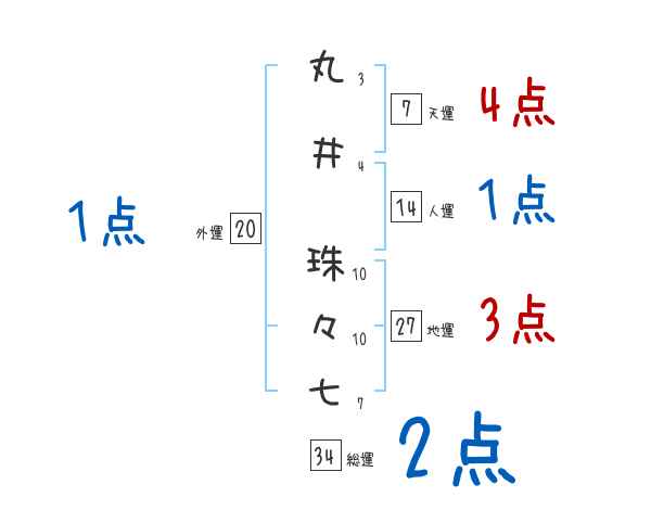 総運![]() | 丸井珠々七さんの総運は34画の2つ星!独創性に優れるが、自尊心が強く災難に注意しましょう。 あなたの人生を表す1番重要な運勢です。生涯を通じて影響する総合運となり、主に50歳以降の晩年期に影響を及ぼします。 |
