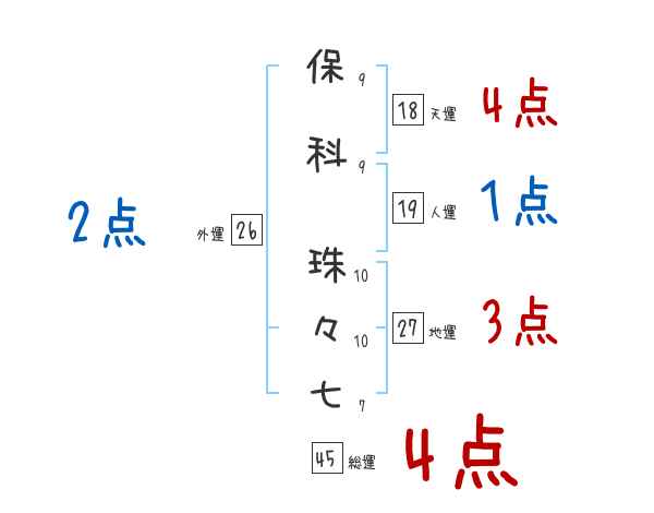 天運![]() | 保科珠々七さんの天運は18画の4つ星!情熱的で剛気。忍耐力があり信頼される。 家系が持つ宿命的な運勢を表します。祖先から受け継いだ苗字ですので自分の力が及びません。家柄を象徴します。 |